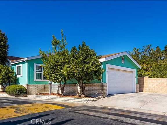 Welcome to this beautifully upgraded manufactured home with a two-car garage located in Crestmont Estates in the heart of Brea. You’ll immediately notice its cheerful exterior lined with citrus trees and low-maintenance turf. Step inside to find an inviting and open living space with upgraded wood-style flooring in the family room and dining area with fresh designer paint and colorful accent walls. The kitchen is outfitted with warm wood cabinetry, stainless steel appliances with ample counter space, and a center island. The primary suite features dual closets, vaulted ceilings and boasts a remodeled spa-like bathroom complete with dual vanities with granite counters, a separate soaking tub, and walk-in shower. Just down the hall are two additional guest bedrooms that share a bathroom with a fresh white vanity and tub in shower. An interior laundry room completes the home and offers direct access to the two-car garage. Community amenities include a pool, spa, clubhouse, library, and billiard room. Conveniently located in the heart of Brea near a multitude of shopping, entertainment, and the 57 freeway.