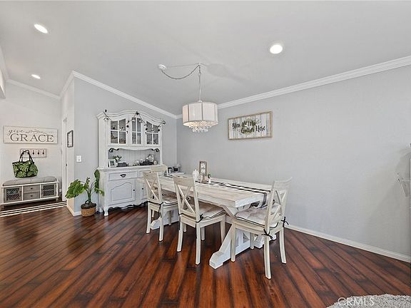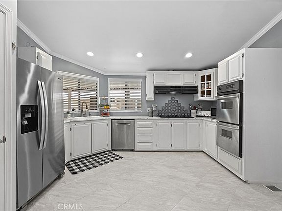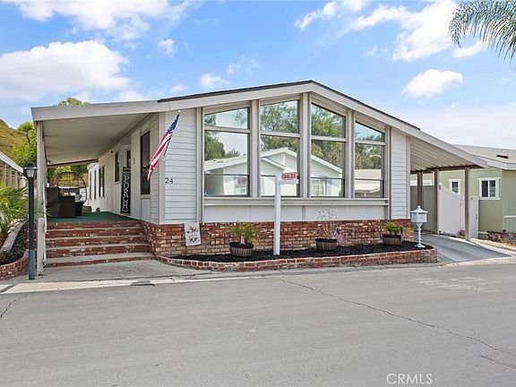 *Back on the market! Seller to sweeten the deal by paying 3 months of land lease fees for the right buyer.* Welcome to Crestmont's all-ages community in Brea's award-winning school district. This space is nestled towards the back of the park with no rear neighbors. It is one of the rare spaces with both a side and a backyard accessed from an up and down porch or from the carport (which can hold up to 4 vehicles). Newly added vinyl fencing gives it a clean look and adds additional privacy for your kids or pets. Large, tinted front windows and red brick add to the curb appeal. Once inside this turnkey 1,440 square foot home, you will notice the natural light from the windows and the vaulted ceilings open up the living area. Crown molding and recessed lighting give this space a clean, fresh look. The recently remodeled kitchen boasts stainless steel appliances including a double-oven, dishwasher, farmhouse sink, RO system, and a Moen touchless faucet. A separate laundry room fits a side-by-side washer and dryer, includes a chandelier, extra recessed space for a deep freezer, storage in cabinets above the washer and dryer, and another closet. The guest bathroom has been refreshed with new paint and a new faucet. The adjoining bedroom has been freshly painted as well. Another unique feature is the large walk-in hall closet that can be converted into a third bathroom. The second guest bedroom has a high vaulted ceiling, new wire closet shelving, and a new fan. The primary bedroom has light switch dimmers, floor-to-ceiling wall storage that spans almost the length of the room, and mirrored glass doors. The primary bathroom has a brand new toilet, separate soaking tub, shower, closet, and his-and-hers sinks. Additional features are the light switch dimmers in most rooms, security system, storage shed at the end of the carport, electrical outlets outside, new screens, a water softener, and motion lights.