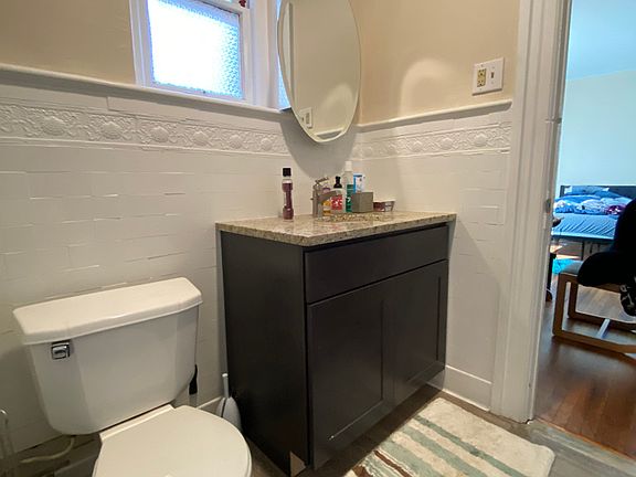 The updated bathroom, with new luxury vinyl floors, granite-topped cabinetry, a medicine cabinet, and a beckoning shower and tub, seamlessly blends vintage charm with modern convenience with original wall tile work, adding historical character. The bathroom is perfectly located between the bedroom and the living room.