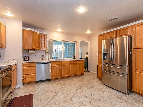 Beautifully remodeled eat-in kitchen with oak cabinets. Features include tile flooring, carpets one year old, cul-de-sac street, did I say views, RV parking, new heating and air installed in 2013, new roof 2019!