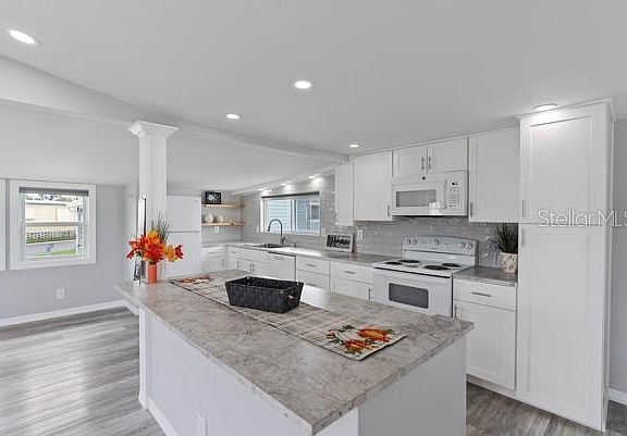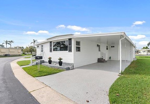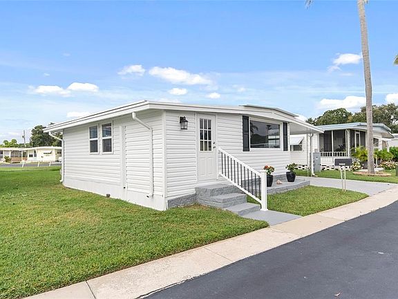 UPDATE: CARPORT HAS BEEN INSTALLED TO NEW CODE STANDARDS! PROPERTY HAS BEEN FURNISHED; ALL YOU NEED TO DO IS BUY ESSENTIALS. PRICE REDUCED. ADORABLE, completely updated, water view w/ fountain in highly desired Holiday Shores. Home has been extended to add an additional full bath, and sunroom has been opened up to add more square footage lending to open concept living. Kitchen is awesome with abundance of white soft close cabinets, a pantry, a large island, open shelving, light gray "wave look" subway tile backsplash and a farmhouse sink, and a NICE VIEW! All new Luxury Vinyl Plank flooring throughout, sheet rocked walls & ceilings throughout. Most newer windows, all new doors, new siding, new 1.5-ton AC plus new mini-split AC, new hot water heater, recessed lighting throughout, roof over and all windows have new cellular shades. There is also an inside laundry hookup added in the newly created hallway bathroom. This property originally only had one bathroom. The primary bedroom has a large Walkin closet, with a new ensuite bath complete with spacious vanity, and a view of the pond with fountain. Holiday Shores allows 2 pets and has a very active social life. NOTE: NEW ROOF 11/2024. NEW VAPOR BARRIER 12/2024. NOTHING TO DO HERE BUT MOVE IN AND ENJOY THE FLORIDA LIFESTYLE! Opportunity for financing through South State Bank or Central Bank. Note: please be aware that the county is currently replacing all of our sewer lines at NO COST TO THE HOMEOWNERS!