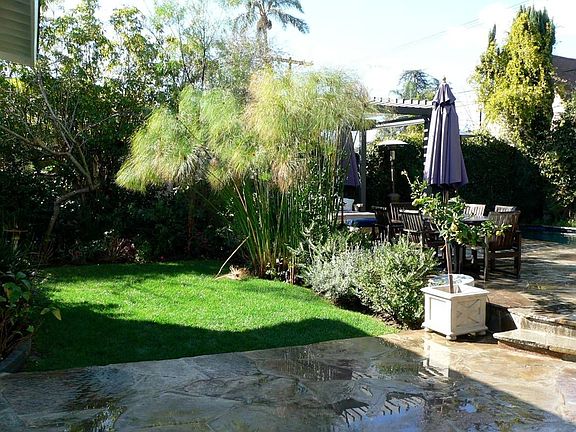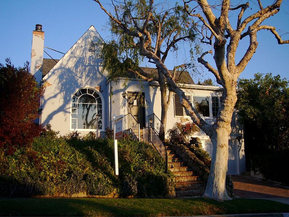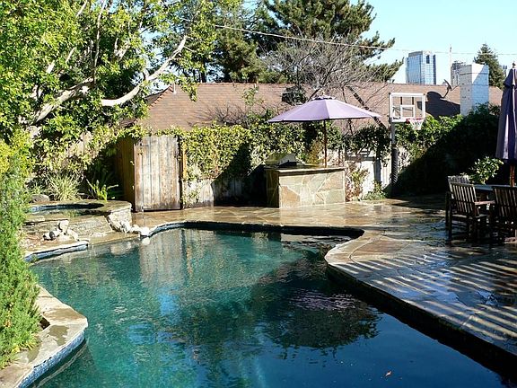 5 Bedroom, 3 bath Tudor Style home, built in 1920's; many original features, including hardwood floors and vaulted ceilings. Move in condition. Remodeled kitchen, with Viking stove. Newly land/hardscaped backyard, with sparkling, solar heated pool and jacuzzi, pergola covered outdoor living room area, built-in barbeque with 5 burner grill and refrigerator. Huge Master suite, with wood built-in closets and space for office or sitting room. Great flow, with family room and dining room off kitchen. New air conditioning. Tree lined street; fabulous neighborhood.