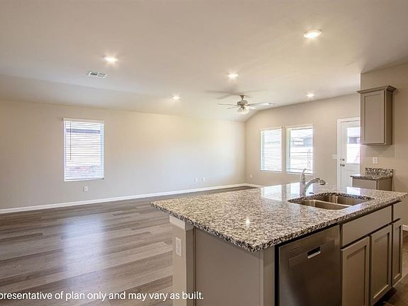 Quick Move-In in Sara Park Community! The Camden is a single story home that offers 3 bedrooms, 2 bathrooms and 1,501 sq. ft. of living space. One secondary bedroom, the utility room, and one guest bathroom greet you at the foyer. The foyer leads to a grand, open-concept dining room, kitchen, and living room. The kitchen features stainless steel appliances, granite countertops, 4' granite backsplash and a corner walk-in pantry with a large kitchen island overlooking the living room. The spacious living room leads to a large covered patio, perfect for entertaining. The private main bedroom suite is located off the living room and features dual vanity sinks, a huge walk-in closet, separate water closet and a large walk-in shower with white subway tile surround. A short hallway off the dining area leads to a third bedroom. Additional features include natural gas, vinyl wood flooring at entry, downstairs, halls, living room, kitchen, and dining/breakfast area, bathrooms and utility room, carpet in the bedrooms, and front yard landscaping. The Camden includes our HOME IS CONNECTED Smart Home base package which includes an Amazon Dot, Front Doorbell Camera, Front Door Deadbolt Lock, Home Hub, Light Switch, and Thermostat