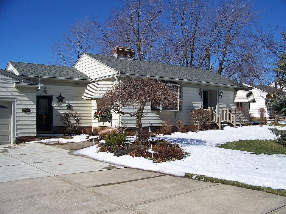 Single Family Home for sale by owner in North Royalton, OH 44133. Exceptionally maintained custom built ranch built by owner. Beautiful solid wood built in cabinets, crown molding and chair rail throughout house. Open concept kitchen and eating area with wood beams along with dual desk and workspace. Hallway, kitchen and eat in area have wood ranch plank flooring. Living room has bay window, 5 piece crown molding, solid wood built in cabinets and wood burning fireplace. Bedrooms have oak flooring under carpeting, ceiling fans and faux wood window blinds. Bathrooms have large linen closets, stained glass windows and built in vanities. Finished basement with gas fireplace, wet bar, build in storage, bookcases and benches. Glass block windows in basement with Pella and Stanek windows in main living area. Beautifully landscaped yard with sprinkling system in the front yard. Built in heated swimming pool with Nature Stone deck along with natural gas grill. Cedar sided storage barn with additional storage behind 2