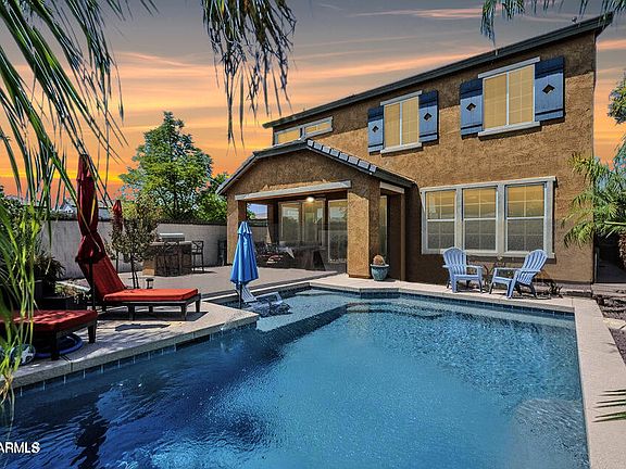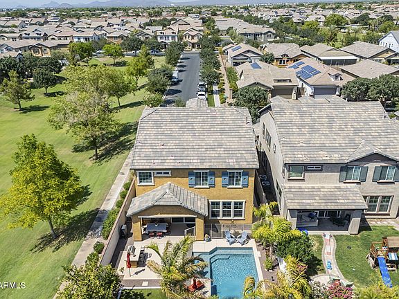 What if your next chapter began here? With tree-lined streets, two community pools, a Georgian colonial style community center, fitness center, sports courts, and multiple parks and playgrounds, this neighborhood is full of storybook charm. Located on a corner lot bordering a lushly landscaped community park, this 5-bedroom, 3-bathroom home is waiting for its next story...YOU! The chef's kitchen features upgraded lighting fixtures, a gas range, granite countertops, stainless steel appliances, large island, and walk-in pantry, ideal for both everyday living and entertaining. The spacious family room offers a cozy fireplace feature and overlooks the sparkling blue pool in the backyard. Downstairs also offers a versatile main-level den which can be used as a home office, playroom, or a 5th bedroom with separate bathroom access as well. Upstairs, the primary suite is a true retreat with a generous walk-in closet and spa-like ensuite bath. Three additional upstairs bedrooms provide ample space for family or guests, while the loft offers even more space to relax or play. Outside, enjoy low-maintenance landscaping and a covered patio perfect for relaxing Arizona evenings. Take a swim in the sparkling blue saltwater smart pool or pick some fresh fruit off of the lemon, lime, or orange trees. The 3-car tandem garage offers plenty of space as well as an EV charger. Mulberry truly feels like a modern-day hometown and is conveniently located near Loop 202, US 60, shopping, dining, and is part of the Gilbert School District. This home truly checks every box!