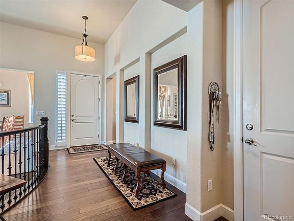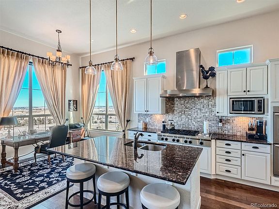 Elegant Ranch Style home in the coveted Montecito neighborhood in Lone Tree featuring stunning City and Mountain views! This 4 bed/4 bath home greets you with its beautiful hardwood flooring and open and flowing floor plan leading past the formal dining room to the gorgeous chef’s kitchen with luxury cabinetry, stainless steel appliances, double ovens, walk-in pantry, 6-burner gas stove and large kitchen island with granite countertops and pendant lighting. Natural light fills the living room with it's 12ft ceilings and stack stone gas fireplace with built-ins. Step outside to relax and enjoy amazing sunsets over the Rocky Mountains and views of Downtown Denver from your covered Colorado room with outdoor fireplace. Spacious primary bedroom and 5-piece primary bath with his and her vanities, tub, separate tile shower and unmatched walk-in custom closet. This former Interior Designer's home also includes an additional main floor guest bedroom with its own custom walk-in closet, separate bath, powder room, plantation shutters, laundry room with cabinetry and large office with French doors. The Lower level features a large guest bedroom with ensuite bathroom, a smaller bedroom that could also be used as a craft room or workout room, and large family room with custom wet bar perfect for entertaining. Three car garage with professional epoxy flooring. Private Montecito Pool access, community social events and high speed internet included in HOA. Unmatched Prime Location! Walking Distance to Lone Tree Rec Center, new Pickleball Courts and Bluffs Regional Park for hiking/biking. Easy access to I-25 and nearby shopping and dining as well as the Lone Tree Arts Center, Library, Light Rail and other great amenities!