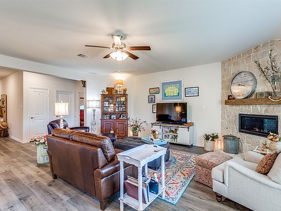 Welcome to this gorgeous open-concept home that seamlessly blends designer finishes with everyday functionality. Bathed in natural light, the thoughtfully designed floor plan offers spacious, connected living areas that create a warm and inviting atmosphere for both entertaining and daily life. The living room features a striking custom fireplace with a natural stone surround and wood mantel. The heart of the home is the stylish, well-appointed kitchen, boasting granite countertops, a large breakfast bar, 42 inch upper cabinets with upgraded hardware, stainless steel appliances, and a generous walk-in pantry. Wood-style flooring flows throughout the main living areas, adding elegance and durability, while modern light fixtures and neutral paint tones elevate the overall aesthetic. The spacious primary bedroom offers a peaceful retreat, featuring a custom sliding barn door that leads to a beautifully updated ensuite bath. Enjoy a spa-like experience in the oversized walk-in shower, along with dual vanities and thoughtfully chosen finishes that combine comfort and luxury. Step outside to a private backyard oasis, where an extended patio and large cedar pergola create the perfect setting for outdoor dining, relaxing, or entertaining under the stars.