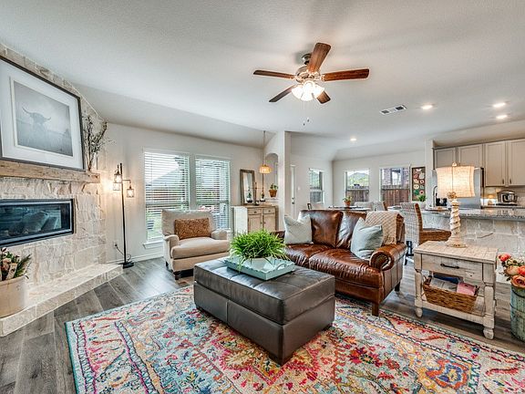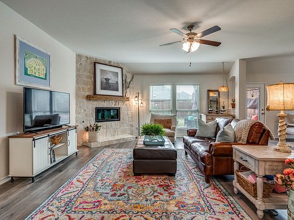 Welcome to this stunning brick-and-stone single-story home in the sought-after Silverado West subdivision of Aubrey, TX. A beautifully landscaped walk-up leads to a covered entryway, setting the tone for the charm and warmth found throughout. Inside, the open floorplan highlights the cozy ambiance of the stone fireplace with gas logs, which can be enjoyed from the main living areas. The raised hearth and custom mantle make the fireplace a standout focal point. Matching stone on the breakfast bar continues the rustic feel, adding character and visual appeal. The kitchen offers abundant cabinetry, generous countertop space, and a gas cooktop, sure to please the home chef. The rustic theme flows into the primary suite, where a barn door opens to the en suite bath featuring dual sinks and an updated oversized frameless shower. Step outside to enjoy a spacious covered patio with ceiling fan, plus an adjacent pergola—ideal for relaxing outdoors or entertaining guests. The large backyard provides ample space for play, gatherings, or furry friends. Residents of Silverado West enjoy a vibrant community filled with amenities, including a pool, pickleball courts, playground, and water play area for the young or young at heart. With easy access to major roads, you’ll appreciate the convenience of getting where you need to go while still enjoying the peaceful charm of Aubrey living. This home beautifully blends comfort, character, and community—don’t miss your chance to make it yours!