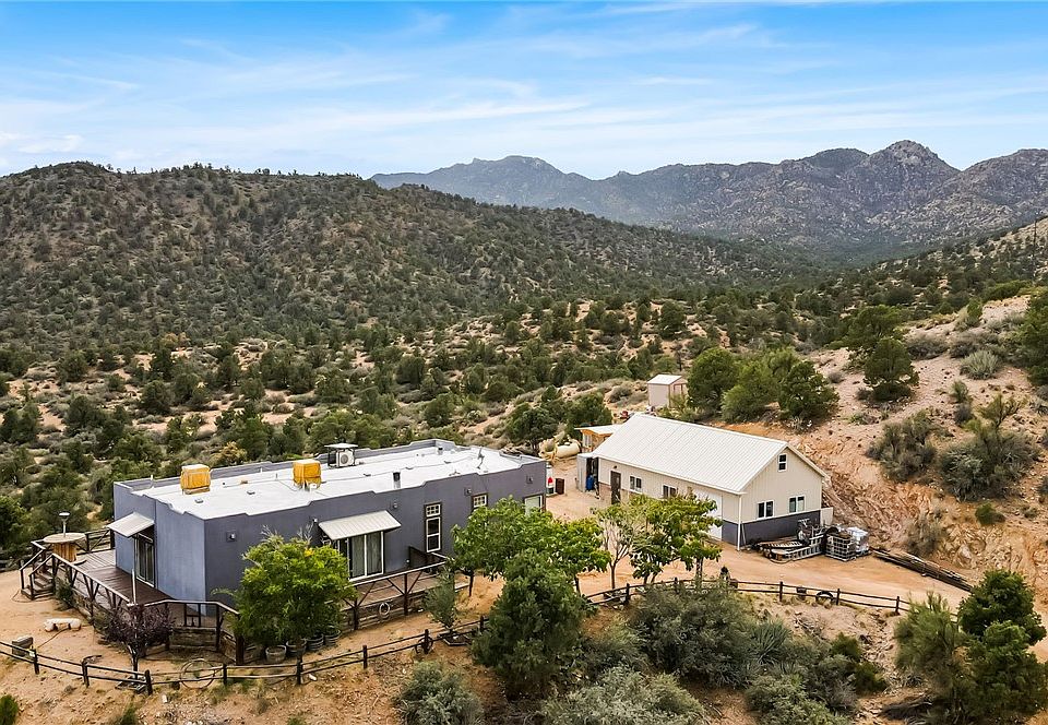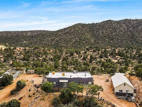 Escape to your own private sanctuary in the heart of northern Arizona with this one-of-a-kind rural property in the desirable Spring Valley Ranches community of Hackberry. Set on just over 9 acres and BORDERING STATE LAND, this property offers unmatched privacy, panoramic mountain views, and the rare opportunity to live surrounded by nature with unimpeded sightlines and abundant wildlife including deer, bobcats, mountain lions, foxes, javelina, and more. Approximately 7-8 acres is fully fenced with wire fencing, three driveways with access gates one with an automatic opener and features a thoughtfully designed layout ideal for those seeking space, self-sufficiency, and tranquility. The beautifully maintained home boasts a split floor plan, rustic LVP flooring, ceiling fans throughout, and a combination of mini-split, HVAC, pellet stove, and dual swamp coolers to keep the home comfortable year-round. The kitchen and laundry come equipped with a refrigerator, washer, dryer, and freezer all included. Step outside onto the reinforced wrap-around deck and take in the breathtaking views from every side of the home or unwind in the above-ground spa overlooking the serene landscape. The property is ideal for homesteading or hobby farming, with small animal pens, a hay shed, and garden area. A 10 x12 greenhouse expands your growing season, while an automatic watering system irrigates both the landscaping and a dedicated wildlife basin. Water is plentiful thanks to a private well with a new pressure tank, and a 2,500-gallon above-ground storage tank that provides added peace of mind. The property also includes some existing underground solar infrastructure, offering the potential for full off grid living. The insulated block and metal garage is a standout feature with a loft, 8-foot roll-up door, and an impenetrable bombed beam block gun safe room reinforced with 5/8 rebar ideal for secure storage or emergency preparedness. A 50-amp RV hookup is located near the animal pens for guests or travel trailers. Spring Valley Ranches offers road maintenance, beautification, and an active architectural committee through its HOA, and the surrounding community features long-term residents who value privacy, open space, and rural living. With so many unique features and such an incredible setting, this property is a rare gem that must be seen to be fully appreciated.
