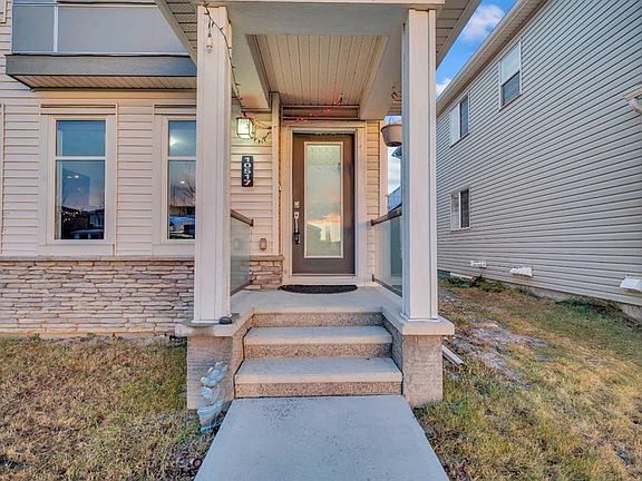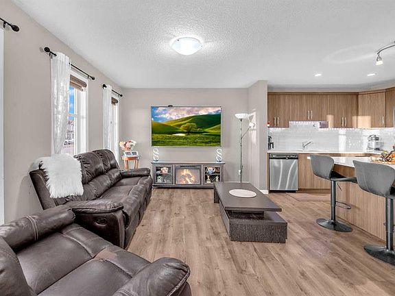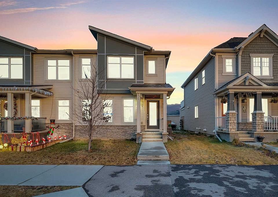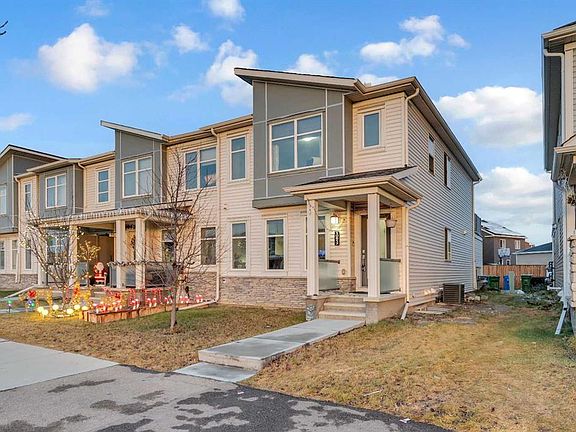 END UNIT with NO CONDO FEES and 1 bedroom illegal Basement Suite. Stylish and sun-filled, this beautifully maintained 3-bedroom end unit offers exceptional value with a double attached garage. The open-concept main floor is drenched in natural light and designed for seamless entertaining. Enjoy clear sightlines between the kitchen, dining, and living areas, complemented by brown cabinetry, quartz countertop, stainless steel appliances, and a central island with breakfast bar seating. Centralized AIR CONDITIONING provides refreshing comfort during Calgary’s warm summer months. Convenient powder room and direct garage access make daily living effortless. Upstairs, a massive balcony sets the stage for summer BBQs and sunset views. The upper level also features a bonus room, laundry, a 4-piece family bath and three spacious bedrooms, including a private primary retreat with walk-in closet and 4-piece ensuite. The developed basement suite features an expansive living room, full kitchen and spacious bedroom with 4-piece bath. The basement includes its own separate laundry. Ideally located at a very convenient location with easy bus access and steps from green space, a community gazebo, and Cityscape Square—home to Starbucks, McDonalds, 7-Eleven, Indian grocery store, gas station, shops, and restaurants. Surrounded by scenic pathways and a 115-acre natural preserve, with quick access to Stoney and Deerfoot Trails, Cross Iron Mills, Costco, the airport, Genesis Centre, and Prairie Winds Park. Call your realtor today to schedule a showing. This home won’t last long. A rare opportunity to own a move-in ready home in a vibrant, walkable community—without the condo fees!