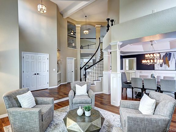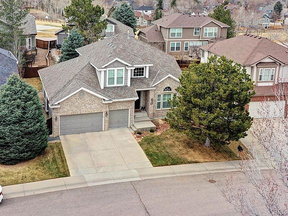 Luxury and Sophistication describes this 5 Bedroom + Loft, 4 Bathroom home nestled on a quiet cul-de-sac within the Stonegate Community! Step inside and you will be impressed with this home’s grand 2-story Entry/Foyer, gleaming hardwood flooring complemented by a neutral paint palette, designer lighting, soaring vaulted ceilings and plantation shutters throughout. Open concept floor plan features a formal Living/Dining Room that provides ample space for entertaining or hosting family gatherings. A spacious Family Room boasts custom built-ins and cozy fireplace with tile surround that seamlessly flows into the well-appointed Kitchen designed for both style and function complete with island/breakfast bar, beautiful leathered granite counters, tile backsplash, pantry, desk area, eating area and stainless appliances - gas cooktop. Whether you’re entertaining friends or cooking up a quick meal, this Kitchen offers everything you need! Main floor Laundry Room with washer/dryer and storage plus 3-Car Attached Garage adds to the effortless living experience. The Primary Suite is a private retreat with sitting area, walk-in closet and en-suite 5-piece Bathroom with soaking tub. Upstairs Loft plus 3 generously sized Bedrooms share a Full Bathroom updated with double vanity plus modern tile, finishes and fixtures. Entertaining or casual living extends to the private fenced yard with deck offering the perfect blend of serenity and outdoor living. The Finished Basement offers 1,026 SF of additional living space featuring a Bonus Room with bar plus a spacious Bedroom with en-suite 3/4 Bathroom catering to a variety of needs from a cozy movie night to a private teen or guest suite. Excellent Parker location with close proximity to award-winning schools, Downtown Parker, CO470 and DIA. Enjoy community pool plus nearby shopping, dining, parks, playgrounds and miles of scenic walking/biking trails making this vibrant community an ideal place to call home.