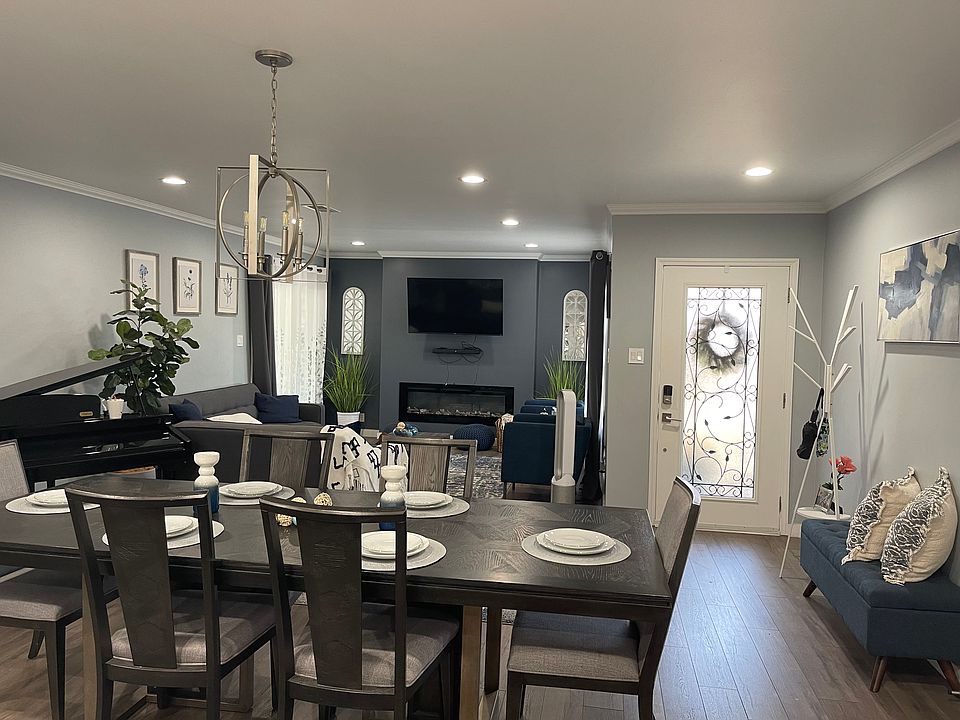 Nestled in the heart of North Downey, CA, this fully renovated 3-bedroom, 2-bathroom home offers modern living with exceptional convenience. Located within walking distance to Stonewood Mall and just minutes from the I-5 and I-605 freeways, you'll enjoy easy access to shopping, dining, and commuting. Step inside to discover a beautifully updated interior featuring wood flooring throughout the home and tile flooring in the bathrooms and detached garage. The open-concept living area is highlighted by an electric fireplace, creating a warm and inviting atmosphere. The kitchen is equipped with all-electric appliances, including a microwave, dishwasher, refrigerator, oven, and stovetop, making it perfect for any home chef. The spacious master suite includes a stylish mirror barn door leading to an additional closet in the bathroom and a sliding door providing direct access to the backyard oasis. Here, you'll find a stunning pool, covered patio seating, and plenty of space to relax and entertain. The detached garage offers more than just parking it includes washer/dryer hookups and EV charging for your electric car. With central air to keep you comfortable and no carpet anywhere in the home, maintenance is a breeze. Don't miss the chance to make this exceptional property your new home!