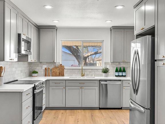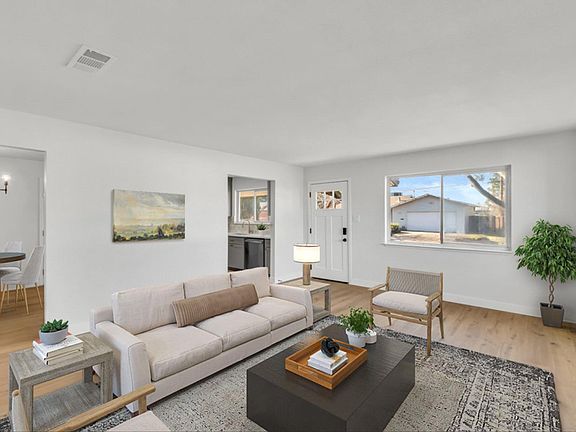 Enjoy the convenience of being right across the street from White Rock Community Park featuring tennis courts, walking paths, and plenty of room to play. This thoughtfully remodeled 3-bedroom, 2-bath home blends modern updates with timeless charm. Step inside and feel the warmth of the inviting living space, where a classic fireplace sets the stage for cozy nights and memorable gatherings. The fully reimagined kitchen is a true showstopper featuring quartz countertops, abundant cabinetry, and stainless-steel appliancesperfectly designed for both everyday living and entertaining. Luxury vinyl plank flooring flows seamlessly throughout, leading to two beautifully updated bathrooms. Fresh interior and exterior paint, hand-selected lighting, and a brand-new HVAC system bring comfort and style to every corner. Outside, your private backyard retreats await lushly landscaped with plenty of space to host, garden, or simply relax under the stars. The oversized side yard offers RV parking potential, while the attached two-car garage ensures ample storage. Come see it for yourself you'll instantly feel at home.