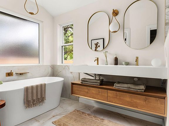 Gorgeous Circle C Modern Designer Home with Stunning Sleek Exterior. :: Kitchen features beautiful white oak cabinets and quartz countertops as well as multiple dining areas. :: Brand new tile, shower & tub systems, and vanities in each bathroom. Primary bathroom features luxurious soaking tub. :: Gorgeous engineered hardwood floors flow throughout. :: Systems updates include new water heater, HVAC exterior condenser and inside unit, plumbing, electrical fixtures, exterior cedar fence, limewash on exterior brick, vinyl windows, and new doors. :: Top Rated Schools & Just minutes to HEB, Slaughter Creek Park, and outstanding community amenities including 4 pools, 6 play scapes, and many parks and trails within walking distance.