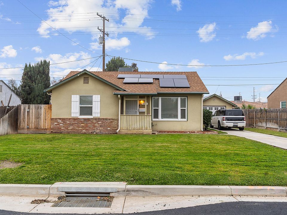 This beautifully maintained Tulare home blends classic charm with smart updates, offering warm curb appeal, owned solar, and a spacious layout ideal for comfortable everyday living. Original hardwood floors and abundant natural light create an inviting main living area, while the kitchen features stainless steel appliances, solid wood cabinetry, and a deep stainless sink. The converted bonus room is a standout perfect as a home office, craft studio, workout space, or second living area with direct views to the freshly landscaped backyard. Both bedrooms are well sized, the bathroom is clean and updated, and the interior feels bright and thoughtfully cared for. The back living space can easily be converted into a 3rd bedroom. Outside, the covered patio, storage shed, brick pathways, and large fenced yard make the backyard functional and low maintenance, with plenty of room for entertaining, gardening, or pets. All set on a deep lot with an extended driveway and detached garage. Located in a part of Tulare that continues to see meaningful investment from new commercial growth to expanding retail, dining, and infrastructure this home offers the comfort of an established neighborhood with the advantage of a city steadily on the rise. A great opportunity to own a move-in-ready property with modern efficiency and timeless appeal.