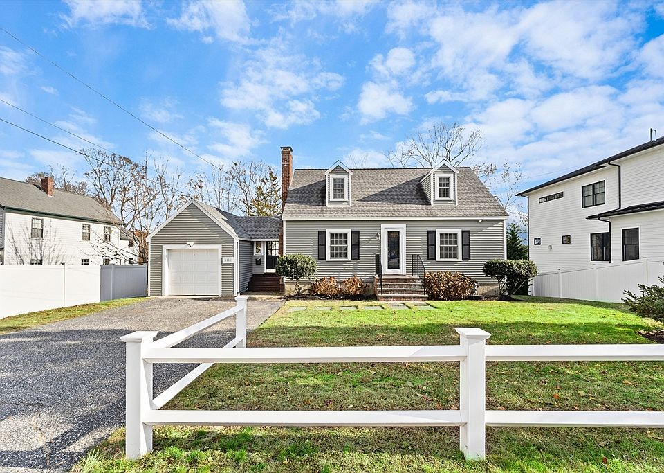 Meticulously maintained four-bedroom, two-bath Cape offering modern updates and classic charm. The sun-filled living room features a cozy fireplace, while central air ensures year-round comfort. The beautifully updated kitchen boasts 2024 stainless steel appliances, white beadboard cabinetry, and granite countertops. The first floor full bath has been tastefully refinished, and the bedrooms provide bright, versatile spaces. The second floor features an additional full bath and two spacious front-to-back bedrooms. A finished walk-out lower level adds valuable living area—perfect for a family room, office, or gym. Step outside through the enclosed breezeway to an Azek deck overlooking a fully fenced-in backyard, ideal for entertaining, play, or relaxing in privacy. The one-car garage adds convenience and storage, and the home is generator ready for peace of mind. Thoughtfully cared for and truly move-in ready, this inviting Cape blends comfort, function, and style throughout.