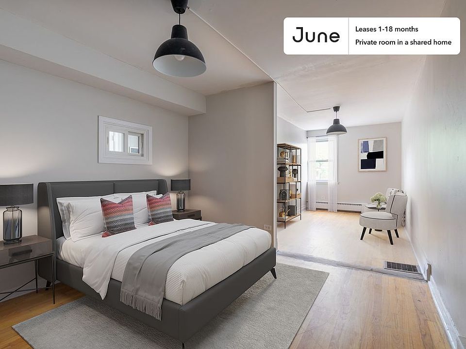 This Queen room in Noble Square is available on a 12 month lease or a flexible short term (31 to 364 days) lease. You pick your custom start and end date. Monthly rent rate is determined by furnishing preference, move-in date and move-out date. Speak to a June representative for recommendations on the best stay duration for the lowest rate.