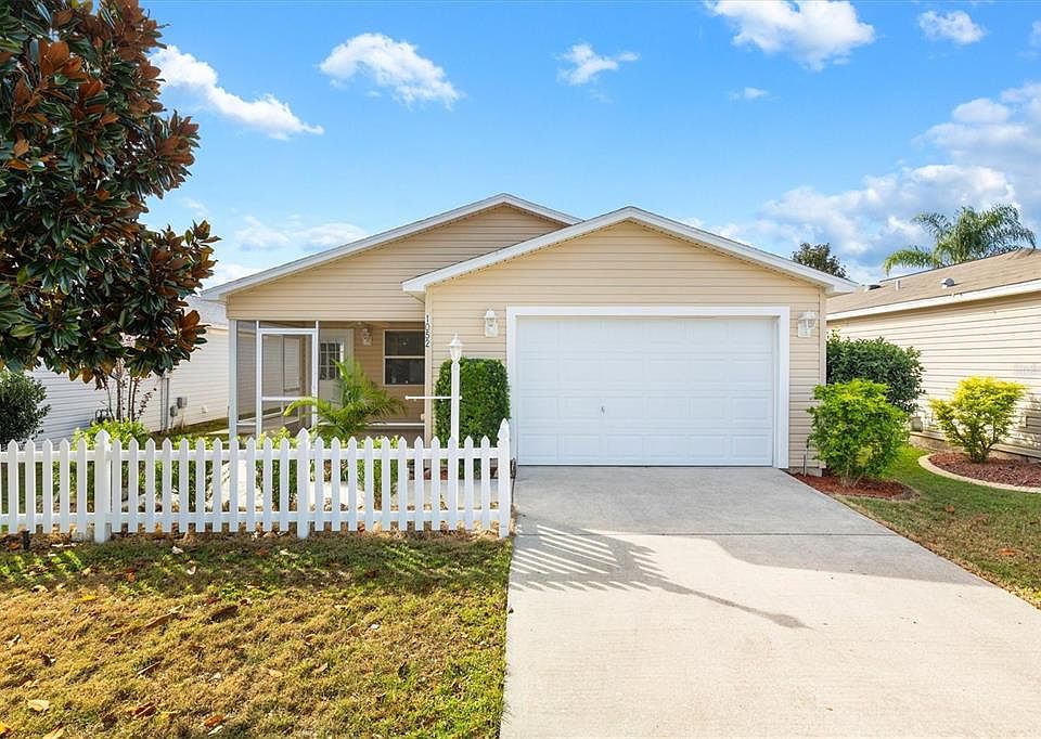 NEW ROOF to be installed prior to closing! Welcome to this charming move-in ready home in the highly sought-after community of The Villages! This is a golf community that is 55+. Boasting fantastic curb appeal with its classic picket fence, this property is fully move-in ready and comes with all appliances included. The garage also provides convenient golf cart parking, making it easy to enjoy the community's many golf courses. Inside, you’ll find 2 spacious bedrooms and 2 bathrooms, with the primary suite featuring a generously sized walk-in closet. The light and airy layout is perfect for relaxing or entertaining guests. The home has been freshly painted and features new LVP flooring. Recent updates include a new A/C unit (2019) and a water heater (2024), ensuring comfort and efficiency for years to come. The Villages offers a vibrant lifestyle with a wide variety of amenities and activities, including golf, fitness centers, pools, and social clubs to suit any interest. Whether you’re an avid golfer, fitness enthusiast, or simply enjoy community events, there’s always something to keep you busy. HOA fee includes water, sewer, trash, and amenities. Don’t miss out on this gem—schedule your private showing today!