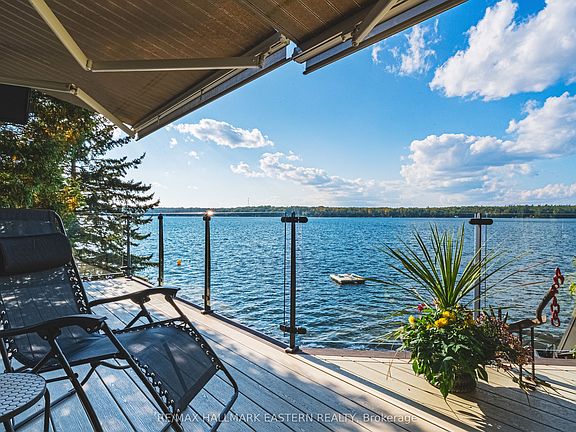 Living in this house is like living on a boat! It is so close to the water you can hear the waves gently lapping at night. Complete privacy in your 1.3 Acres 270 Ft waterfront oasis on Clear Lake awaits. So much thoughtful quality here has to be seen to be appreciated. Mature trees, dappled light and a feeling of magic envelope this mid century boathouse conversation. Tucked into a beautiful cove with natural sand beach sits a totally unique blend of cottage feel with the quality and convenience of a luxurious 4 season bungalow. Drive right to your door and only I step into this open light and bright space. So much attention to detail has been taken for ease of living. White oak wide plank flooring, soaring ceilings and massive amounts of glass bring the lake in from every room. Custom cabinetry adorn this chef's kitchen. Neutral palettes throughout and expansive rooms welcome any decor. Full walkout and covered decks on the lower level for shady summer days, a hot tub set into the landscape, a gazebo for relaxing after a swim in the crystal clear dive off the dock water. Pull your paddle board or kayak up on the natural sand beach, hop in your boat off one of two lifts and explore the beauty of this gorgeous lake on the Trent System right at your door. Keep all your toys safe and clean in the ICF garage and grand loft for play above. Bunkies for the kids, parking for huge parties, huge newer septic, newer drilled well, all systems on massive generator if the power goes out. Boat to Wildfire for Golf, dine at one of three waterfront restaurants and play on the iconic Clear and Stoney Lakes. Meet new lake friends at Juniper Island for tennis, pickleball, sailing, explore granite islands, coves and natural beauty to explore at a world class level. Live here 4 seasons, enjoy it on weekends or use it as a gorgeous retreat home. minutes from the charming village of Lakefield.1.5 hrs from the GTA, 22 mins to Peterborough. Don't miss this opportunity to live your dreams