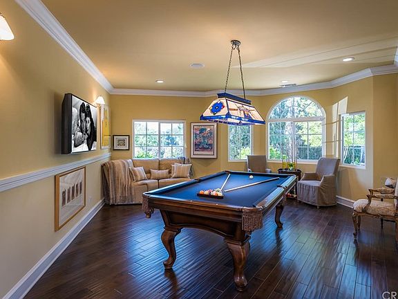 Perched high above it all with spectacular views, this secluded, formerly celebrity owned estate, is an architectural masterpiece. Situated on approximately a half acre private lot, this home is remodeled & updated to perfection. This one of a kind gem is approximately 4,500 sqft and features 4 beds, 4.5 baths, an expansive living room, a game/rec room, and a den. The gourmet chef's kitchen has a large island, two sitting areas, pantry, Baroque glass tile backsplash, Kohler sinks & faucets, and Viking & Miele appliances such as a Subzero fridge, double oven, 6 burner stovetop, and built-in microwave.Enter the Master suite with enormous his/hers walk-in closets, and en suite bathroom with dual sinks, a Hydro Sys 6' tub, and separate glass enclosure shower. The home also boasts 2 fireplaces with custom built mantels, beautiful custom wainscoting, 7" crown molding & baseboards, distressed wood floors, Carrara & Calcatta Marble, Restoration Hardware fixtures, Nano full home sound system, plantation shutters, and offers a 2-car attached garage. Head down to the basement to experience the custom designed air conditioned wine cellar that holds up to 535 bottles. Exit to the spectacular, entertainer's backyard to enjoy a sparkling pool with energy efficient equipment & spa, multiple sitting areas, large open bungalow, fire pit, DCS BBQ, and large play area. Conveniently located to the 118 fwy and moments from the shops of Porter Ranch, this is truly a remarkable home.