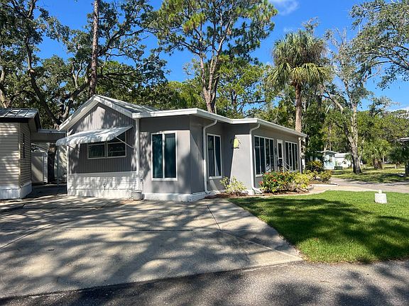 DEAL OF THE YEAR! BEAUTIFUL, PRISTINE, CORNER LOT WITH LOW LOT RENT is this 1-Bedroom, 1-Bathroom PARTIALLY FURNISHED home in Oak Springs RV Resort! Oak Springs is a HIDDEN GEM next to Werner Bryce State Park in Port Richey, Florida, The LOW LOT RENT is $474 a month which includes Water, Sewer, Lawn Service, a place to take your Trash and ALL the Amenities of the Park! HIGHLIGHTS: Roof, Shingled in Excellent Condition, Skylight NEW 2023, AC Mini-Splits Heat & Cool NEW 2024 with 3 Heads, Kitchen, Bedroom & Florida Room, Flooring (Vinyl) NEW 2024, LED Lights in Kitchen NEW 2024, Dehumidifier NEW 2024, Washer NEW 2024, Florida Room Walls NEW 2024, Florida Room Flooring Tile, High-Rise Toilet, Walk-in Shower, Electric Fireplace, Smart Television, 2-Car Driveway, LARGE Back Patio, BEAUTIFUL Landscaping on Corner Lot to CATCH THE GULF BREEZE! DO NOT MISS THIS LOVELY HOME, IT WILL NOT LAST LONG! Oak Springs RV Resort is an Adult Community, Pet Friendly allowing 2 Small Pets or 1 Large Pet under 60lbs. NO AGGRESSIVE Breeds Please. It is a VERY ACTIVE Park with a Heated Swimming Pool, Shuffleboard Courts, Horseshoes, Billiards & Card Room, Clubhouse, Dog Park and MANY Community Events! The Park is minutes away from Hudson Beach, Fine Restaurants, Shops, Stores, Golf Courses, Bayonet Point Regional Hospital and many Indoor and Outdoor Activities! DO NOT MISS OUT ON FUN IN OAK SPRINGS!