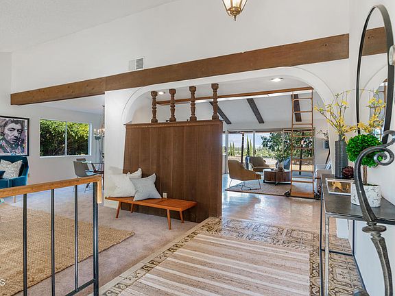Filled with classic mid-century charm & character, this delightful 4-bed, 2-bath ranch-style home boasts 1,950 SF of living space in the desirable neighborhood of Northridge. Situated on a generous 24,023 SF lot, this property offers a unique opportunity to create your dream home and also has ADU potential for guests or rental income. Step through the double doors and into the entryway, welcoming you into the living room with high ceilings, handsome wood accent wall, and cozy brick fireplace. The adjacent dining room is light & bright and leads to the eat-in kitchen with tile counters, double sink, and pass-through window to the envy-inducing family room which includes a wood-beamed ceiling, a dry bar, a gorgeous built-in library shelving with rolling ladder, and sliders to the backyard. This is the perfect space to relax after a long day or host guests and create memories with loved ones. The bedrooms are large and the primary suite includes a vanity area, ensuite bath, and enormous walk-in closet. There is also a convenient laundry room and attached 2-car garage. The impressive yard has a concrete patio with stunning views of the surrounding valley and plenty of room to garden, play, or install a pool or an ADU - the possibilities are endless. Close proximity to shopping centers, restaurants, parks, and schools. Don't miss this exciting opportunity to make this incredible property your very own.