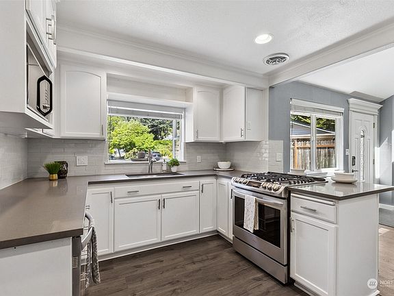 Space, privacy & updated throughout! The bright new kitchen is the heart of the home with Quartz countertops, Stainless and breakfast bar all open to large living room and great room area. Primary bedroom on the main floor with 5 piece bath including large jetted soaking tub, Two bedrooms up with bath 3/4 bath. Large finished 2 car garage with shop, w/heat & AC, wired 220, Low traffic fenced quiet cul-de-sac lot with large covered deck with Gazebo for year round entertaining. Extras include: Air Conditioning, vaulted ceilings, tons of storage, freshly painted in & out, skylights, sprinkler system, long driveway, shed w/power & fantastic location! Just minutes form I405, Schools, Totem Lake, Juanita Village & beach.