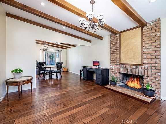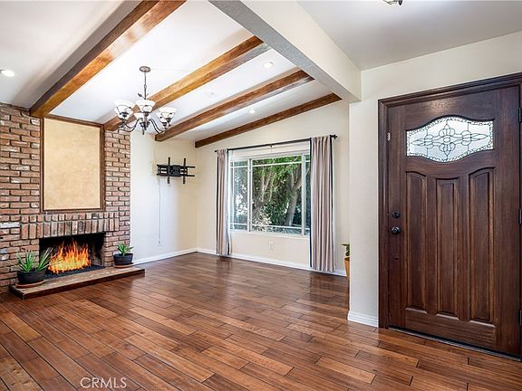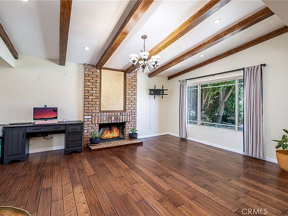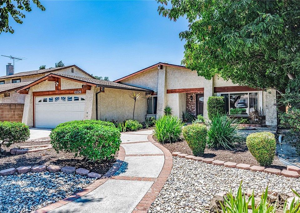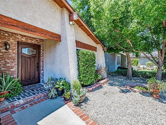 This bright and spacious 3 bed, 2 bath home includes 1,440 sf of living space on a sizeable 7,500 sf lot. Impressive, drought-tolerant landscaping with meandering walkways creates eye-catching curb appeal. Recently remodeled with rich hardwood flooring throughout, fresh paint, and updated AC. The home boasts vaulted and beamed ceilings in the living and dining rooms, picture windows that capture sunrises from the east & sunsets from the west, and a brick fireplace is showcased in the living room. A family kitchen features a large, center island with seating, built-in wine storage, granite countertops, and sliding glass doors that open to the back, covered patio. There are 3 good-sized bedrooms, 2 of which share a full, hall bathroom, while the primary bedroom offers a private en-suite, which has recently been redone to create a zen, spa-like experience. Enjoy endless outdoor entertaining in the expansive backyard featuring a covered patio with recessed lighting, above ground spa, end-to-end sport court, and room to add your own, creative touch. Amazing location near shopping & dining, including Northridge Fashion Center, and Westfield Topanga, outdoor recreation, and nearby access to the 118 freeway.