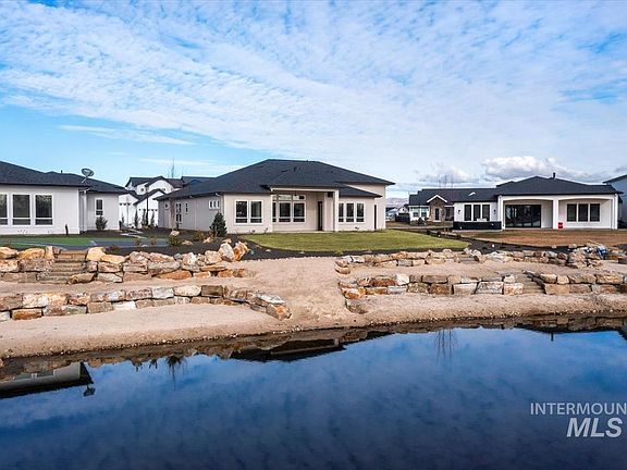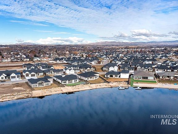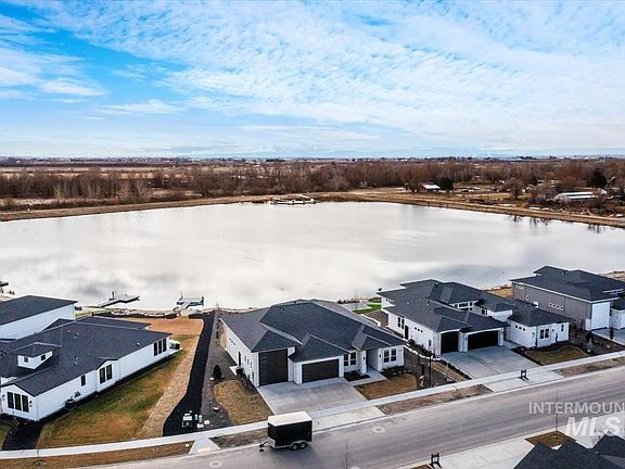 Picturesque setting backing to a spacious lake framed by the abundance of trees along the Boise River in the background where you'll find wildlife, walking trails, plethora of open space & more! Enjoy your private beach area along the lake & prepare to be captivated by the impeccable views & endless recreational possibilities. This single level home by Shadow Mountain Homes, is thoughtfully designed & provides an efficient layout. The owner's suite features an expansive space overlooking the lake, offering walk-in-closet connection to laundry room, a luxurious bathroom w/walk-in tiled shower & double vanity. Spacious kitchen w/designer appliances including fridge/freezer combo, double oven, huge pantry & open concept layout connecting to the beautiful great room, all with a grand view to the lake. Home features an oversized garage with RV Bay including a back garage door opening up to the lake. East lot line adjustment process has begun and is to be completed and recorded prior to closing.