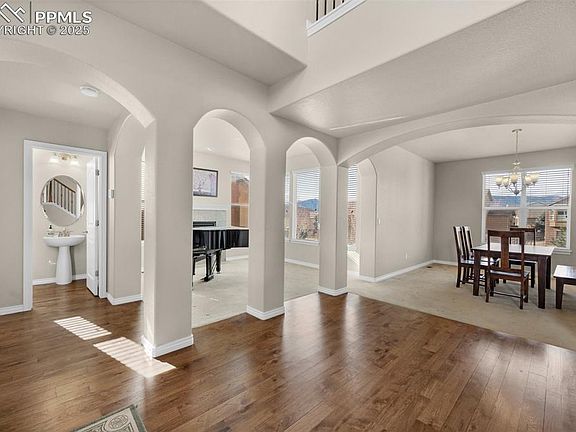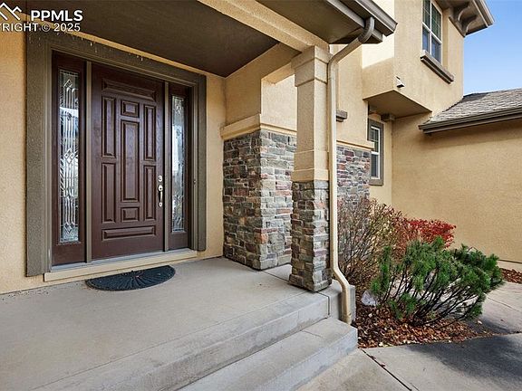 Amazing, Immaculate Home Ready Now! Located In The Prestigious Flying Horse Community This Home Features 20 And 9 Ft.+ Ceilings, Central Air, 5 Bedrooms, 4 Bathrooms & 3 Car Garage & Security System! Step Into Home And Your Eyes Will Take You To The 2nd Story! Entry Enjoys Beautiful Hardwood Floor! Walk To The Very Open Formal Living Room With 20 Ft. Ceiling And Notice The Pass Thru Gas Fireplace And Lots Of Windows That Extend To Upper Level. An Extended Archway Takes You Into The Kitchen. The Kitchen Features A Sitting Desk, Granite Countertops, 42" Cabinets, Stainless Appliances (Refrigerator Is Included) A Pantry, Center Island w/Pendant & Recessed Lighting And Patio Doors To A Great 23x11 Composite Deck That Overlooks The Green Space With Hiking Trail Behind Home With Mountain & Peak Views! The Formal Dining Room Enjoys The Opposite Side Of The Pass Thru Gas Fireplace. Dining Room Also Has A Built In Cabinet & Shelving! The Office/Den Has A Gas Fireplace And Could Be A Sitting Or Music room. Laundry Is On The Main Level & Washer/Dryer Are Included! Upstairs The Primary Suite Enjoys A Gas Fireplace, Vaulted Ceiling w/Ceiling Fan And Amazing 5-Piece Master Bath With A Soaking Tub! 2 Other Bedrooms Are On This Level, Both Have Vaulted Ceilings. The Finished Walk-Out Basement Enjoys A Gas Fireplace In The Family Room With A Wet Bar. All Bathrooms & Wet Bar Have Silestone Counters. Walk-Out To 24x40 Patio In Back With A Fire Pit! The Fenced Back Yard Is Beautifully Landscaped With A Sprinkler System. If You Don't Like Neighbors Right Behind Your Home, This Home Has a Beautiful Easement With Hiking Trail In The Middle! You'll Enjoy Mountain & Pikes Peak Views From Home! Home Also Has 2 Furnaces, 2 Air Conditioners. Home Is Located Near Hiking, Shopping, Parks & Fire Station!