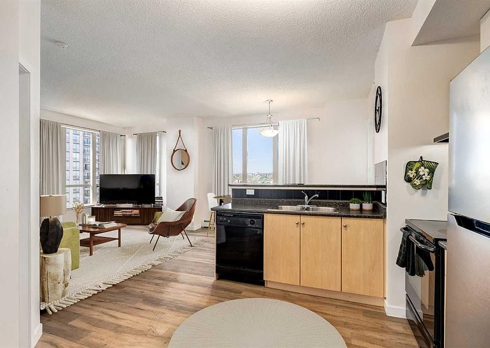 Enjoy life in the clouds as you look out from your new home on the 16th floor and soak in the gorgeous rocky mountain views by day and the glowing downtown skyline by night. This move in ready 2 bed, 2 bath almost* 800 sq ft corner unit condo is filled with natural light thanks to its large windows and south and western exposures. The breathtaking sunsets and twinkling city lights views will never get old. The open-concept layout makes everyday living convenient and entertaining effortless. The living room is bright and inviting and flows into a functional kitchen with a breakfast bar and yes there is room for a table. Step outside onto the generously sized covered balcony where you can enjoy morning coffee, dine al fresco (it’s a great place to BBQ), unwind in the fresh air and take in your urban surroundings. You’ll find two great sized bedrooms, including a primary retreat with its own private 3pc ensuite and a second bedroom with easy access to another full 4pc bathroom making this floor plan ideal for roommates and hosting guests. Timeless vinyl plank flooring runs throughout the unit and in suite laundry means laundry day can be whenever you decide. BONUS: Your condo fees take care of the essentials: electricity, heat, and water/sewer, all rolled in! The excellently located building offers peace of mind and is the epitome of a ‘lock it and leave it’ lifestyle with 24-hour concierge/security services onsite. You’ll also enjoy access to a fully equipped fitness center, bike storage and your own secure, titled underground parking stall so you can say goodbye to scraping your windshield in freezing temperatures. When it comes to location, it doesn’t get much better: the grocery store is literally steps away, and you’re surrounded by some of the city’s best restaurants, coffee shops, pubs, boutiques and nightlife meaning you will always have something to do. Commuting is easy with the c-train and major roadways just minutes away. Add in the nearby River pathways for biking or walking, plus the vibrant energies from trendy neighbouring downtown districts like Kensington, and you’ve got the recipe for a truly magical inner-city lifestyle.