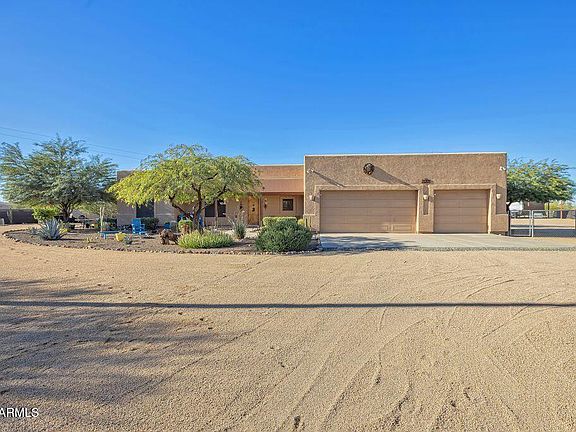 Exceptional Desert Hills property offering space, privacy, and unmatched versatility! This beautifully maintained home sits on an expansive lot and features a 700 sq ft fully equipped casita, ideal for multigenerational living, guests, or rental income (currently Airbnb). The main residence showcases an inviting open floor plan (12' ceiling great room), granite counters and travertine floors. Open kitchen. Several fruit trees. Equestrian lovers will appreciate the lighted 4 horse stalls w/auto water, large turnout area with sprayers for horses, hay barn. Plenty of room for trailers and equipment with easy access. The property also includes RV parking for up to 3 units plus a full 50 amp RV hookup (water, sewer, and electric) for an additional RV—perfect for visitors or extended stays The casita offers its own kitchen, living room, bedroom, bathroom, laundry and private entrance. Main house additional items: bedrooms have 10' ceilings, surround sound inside and outside, shade covers for back patio, custom wrought iron gates, mister system on patio. Interior recently painted. Located in the highly desirable Desert Hills community, this home offers quiet rural living just minutes from shopping, dining, and freeway access. A rare opportunity to own a truly flexible property with room for family, animals, and all your toys. There are 5 250 gallon tanks to collect rainwater. 20 minutes to TSMC, 45 minutes to Wickenburg, and just minutes to dozens of riding trails. See list of upgrades in the documents tab.