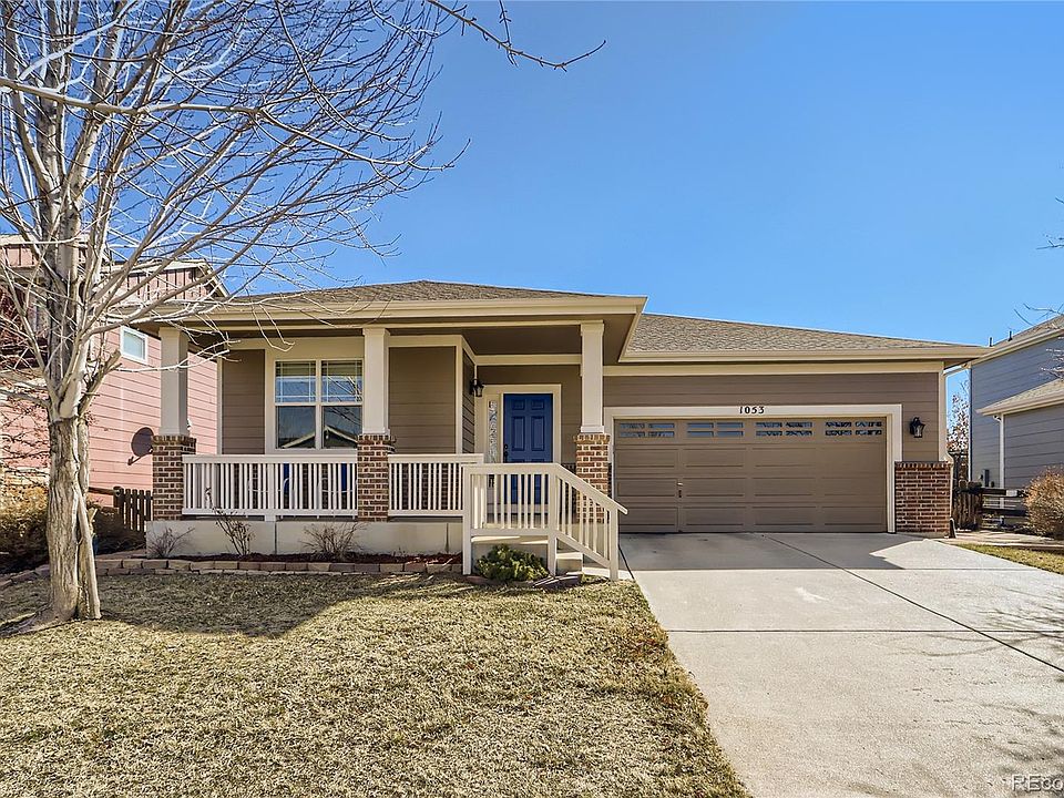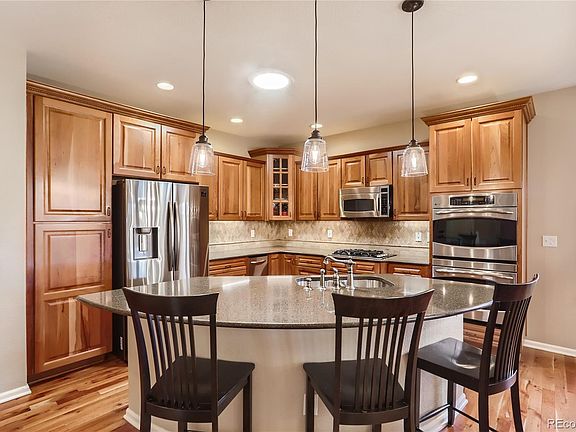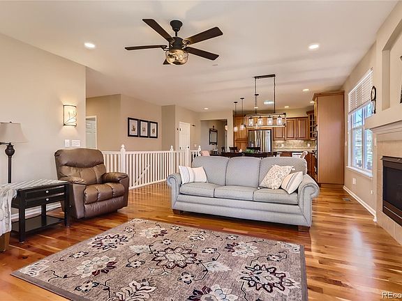 Beautiful ranch-style home with a large finished basement in the desirable Erie Commons community! The main level greets you with a spacious entrance foyer that leads into the main living spaces. A sunny office space at the front of the home offers a tranquil retreat perfect for working from home. Stunning cherry hardwood flooring leads into the open and spacious kitchen at the heart of the home that boasts stainless steel appliances, a large kitchen island with seating, and beautiful granite countertops. The dining space just off the kitchen leads into the cozy and comfortable living room complete with a gas fireplace for cool Colorado evenings and access to the patio for great entertaining. Down the hall, discover three generously-sized bedrooms and two bathrooms, including the primary bedroom with a private five-piece en-suite bathroom. The main floor laundry room and access to the attached two-car garage offer everyday convenience! Downstairs, an additional workspace in the hall is perfect for remote workers or at-home study space. A fourth bedroom, additional flex room, and full bathroom offer even more space perfect for a guest suite! Endless possibilities await in the large basement bonus room, complete with a kitchenette! Completing this move-in-ready property is a fenced backyard with a covered deck and professional landscaping. Enjoy living in this fantastic community that offers a seasonal pool, parks, and playground!