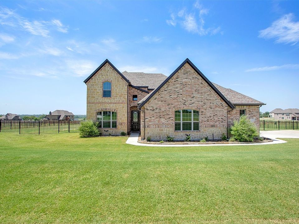 This spectacular home sits on a generous acre+ lot, offering the perfect blend of space, comfort, & luxury. Step into soaring ceilings and an abundance of natural light creating an inviting and welcoming atmosphere. A spacious and well-appointed kitchen, with granite countertops, and ample cabinet space, is a chef's delight & ideal for hosting gatherings with family & friends. The downstairs living room boasts a cozy wood-burning fireplace, providing the perfect spot to relax during chilly evenings IF they ever make it back to Texas. The 2 primary bedrooms downstairs make this home a perfect option for multi-generational living. The 3 bedrooms upstairs are generously sized, offering plenty of space for family members or guests. The media room is a fantastic bonus, providing endless possibilities for movie nights or gaming enthusiasts. Located in the charming town of Howe, you'll enjoy a peaceful, friendly community atmosphere while maintaining easy access to the Metroplex.