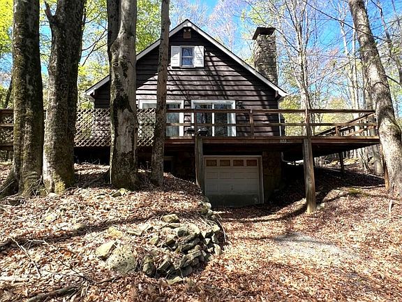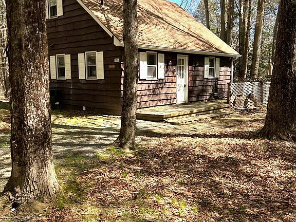 Indian Rocks home on two lots that provides you two accesses to the house. A flat access from the community road (Deerfoot Road) and also access from Ledgedale Road. The combined lot size is .41 and has a large driveway and side yard with firepit. This is a 2 bedroom 1 bathroom cape cod/chalet style house that feels like a ranch house on the main level but then enjoy either a 3rd bedroom or a second living room in the large loft above. Bathroom has been completely remodeled with tile shower and tile floor. The living room has a brick wood burning fireplace and two sliding doors to access the deck facing Ledgedale Road and Lake Wallenpaupack. The full unfinished basement gives you options to either finish for more living space or store your UTV. The basement has a garage door that is accessed from Ledgedale Road. You can park cars or boats/UTV's and have easy access to Ledgedale Road. Washer and Dryer is also in the basement along with a single access door to outside. Back upstairs the kitchen is small but can be very functional with a little vision.There is a very small seasonal view of Lake Wallenpaupack. Community Water is an additional monthly fee.