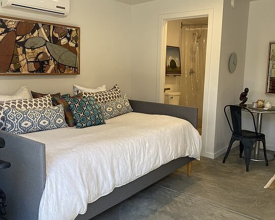 Discover a charming and stylish furnished studio casita in a prime location. This unique residence features artistic concrete flooring, a sleek stainless steel kitchen, and a spacious walk-in closet. The highlight of this home is the beautifully landscaped private courtyard, perfect for relaxation or entertaining. Enhancing its appeal, the property is dramatically illuminated at night, creating a warm and inviting ambiance. Additional Features: * Parking permit included * Utilities included. An exceptional opportunity for those seeking a distinctive and well-appointed living space in a sought-after neighborhood.