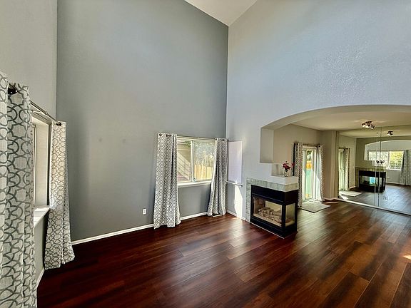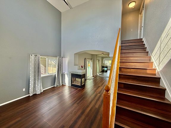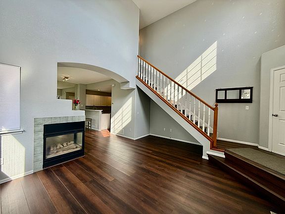 *As you enter, there is a living room with a gas burning fireplace, beautiful laminate wood floors and vaulted ceilings with skylights.