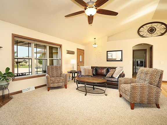 4 BR, 3 BA Ranch in Grand Chute with 2990 SF+/- on .32 +/- acre lot. Enter into the soaring ceilings of the LR w/gas FP w/tile surround that is open to the DR, which flows around to the kitchen w/ island, SS appliance and pantry. Split bedroom floor plan, Trayed MBR ceiling, WIC, shower in MBA and dbl sinks. 2 other sizable BRs on this floor. Full Bath w/tub, LR. LL has FR w/multiple egress windows. French doors separate kitchenette area w/eating bar, full BA w/tub surround and final 4th BR. Architectural arches throughout home. Deck & Patio. Atch'd 2.5 car garage, landscaped, cul du sac lot.