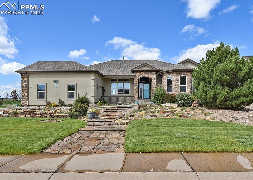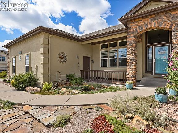 Main level living at its finest! Come see this wonderful 5 bedroom, 4 bath, 3 car garage, ranch-style home. This home is positioned on an oversized cul-de-sac lot with a great view of Pikes Peak. Beautiful wood floors and vaulted-ceilings greet you as you enter the bright and open living room with large windows, a gas fireplace, and built-ins. Enjoy the newly updated kitchen with new granite counters and upgraded stainless steel appliances including the double oven, gas stove top, refrigerator, and more. Sit at the breakfast nook to relax and share your lattes. Even the sinks and faucets were upgraded. The large master bedroom suite includes two separate sinks with the 5-piece ensuite, a good sized shower, and two spacious walk-in closets. Finish the main level with an additional bedroom, large office, another full bath, formal dining room, butler’s pantry, and the laundry room with direct access to the oversized three-car garage. Entertain or enjoy relaxing evenings with beautiful sunsets in the privacy of your double-fenced backyard with a large stamped concrete patio area while sitting next to your fire pit. The finished basement includes a massive rec room, three more large bedrooms and two separate unfinished areas for storage or maybe a work-out room. So many improvements, like the exterior painted and sealed with elastomeric paint. All the trim repainted. The roof is less than thee years old. And more. Experience the highly desirable Meridian Ranch, which boasts 500 acres of parks, trails, and open space, the Antlers Golf Course, two Rec Centers with over 42,000 sq.ft. which incorporates heated indoor & outdoor pools, the lazy river, multi-purpose courts, an indoor gymnasium, indoor track, top-of-the-line fitness equipment, and a daycare with playground. Close to shopping, restaurants, and easy access to military bases. Don’t miss out on this fantastic opportunity. Schedule a showing today.