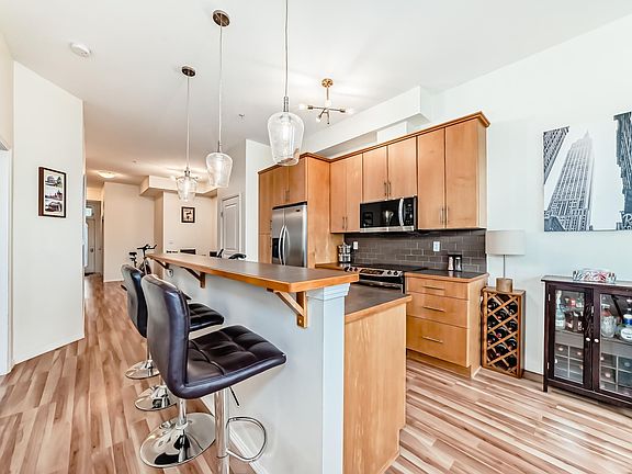 West-facing unitMaple kitchen cabinetryAmple countersBreakfast barFormal dining areaIn-suite laundryWalk-in closet