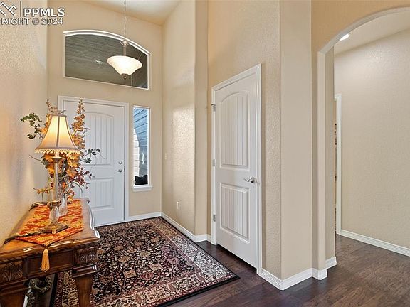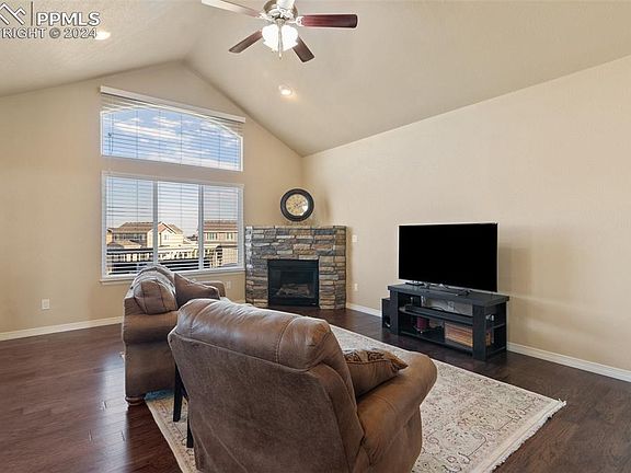 Welcome to this beautiful Ranch style home boasting 4 bedrooms, 3 baths and 3-car garage in the popular Meridian Ranch community. A covered front approach leads to a dramatic vaulted entryway which greets all who enter this wonderful home offering impressive main level living featuring lovely wood laminate flooring flowing throughout the open living area beneath soaring ceilings. A corner gas fireplace is the focal point of the great room adjacent to the country kitchen, providing a comfortable space for daily living, as well as family and friend gatherings. The spacious eat-in kitchen grants access to the back deck and is well-appointed with granite counters, ample cupboards, walk-in pantry and SS appliances (included). The large island includes informal bar seating, and the cook will love the gas stove/oven. The main level includes an office with tray ceiling, a primary suite, an add'l bedroom with walk-in closet and full bath. The primary bedroom boasts vaulted ceilings and an en-suite bath featuring a double-sided gas fireplace, double vanity, soaking tub, tiled shower and walk-in closet. In the walk-out basement, you'll appreciate the 9-ft ceilings, a huge family/rec room equipped with a wet bar (full-size fridge included) and pool table (included), two spacious bedrooms, a full bath and a huge mechanical/storage room plus a small storage room with a full-size freezer (included). All baths offer granite vanity tops, tiled tub/shower surrounds and tile flooring. The fully fenced backyard is a private oasis where you can enjoy the outdoors on a spacious deck, on a covered patio, in the hot tub or gathered around the fire pit surrounded by lush green grass and beautiful landscaping. This home is just minutes away from the golf course and rec center which offers a fitness center and 2 pools. Meridian Ranch is a wonderful community offering its residents many amenities to enjoy. Shopping center is nearby and it's a short drive to Colorado Springs. See it today!