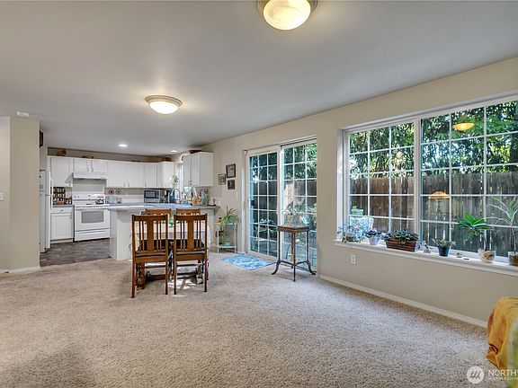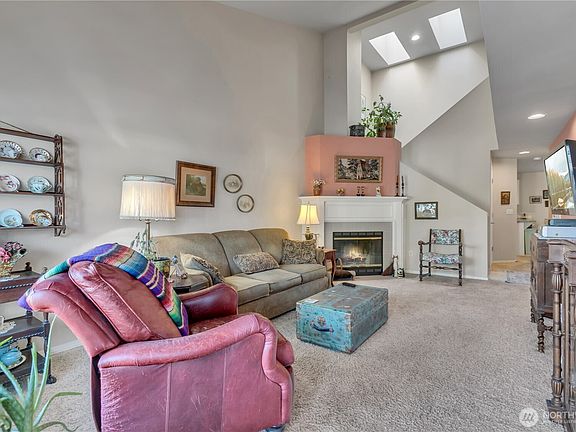 Quiet Townhome community in Kent with private attached 2 car garage and fenced yard. From the covered front porch you'll enter into the first of 2 living rooms. You'll be greeted with soaring ceilings and a cozy fireplace. Around the corner you'll find an open concept kitchen and the second living room and half bath. The kitchen has all appliances included, a pantry and a peninsula with space for eating. There is room for a dining table by the slider. From here you could head to the private fenced yard or the second living space. Upstairs is an insanely large primary bedroom with 2 closets and a 5 piece bath. The laundry room with a tub sink is down the hall along with the second full bath and 2 more bedrooms. Close to shopping and dining.