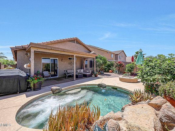 Auga Fria Ranch off of Olive! Great location close to Spring training ballfields & Cardinals Stadium. Updated, MOVE-IN READY home! No neighbors behind you! This single story, 3 bed 2 bath home includes vaulted ceilings, lots of windows give natural light, beautiful acacia style plank tile flooring in living & family rooms, Luxury vinyl tile in bedrooms. Eat in kitchen includes staggered Maple cabinets w/ beautiful granite covering ample countertop space, family room looks out to the backyard which includes a low maintenance small pool where you can cool down & enjoy the massaging jets. Mountain views, propane fire pit. Large primary suite w/ beautiful tiled walk-in shower, dual vanities & walk-in closet. 2nd & 3rd bedrooms are also spacious & have walin closets also.