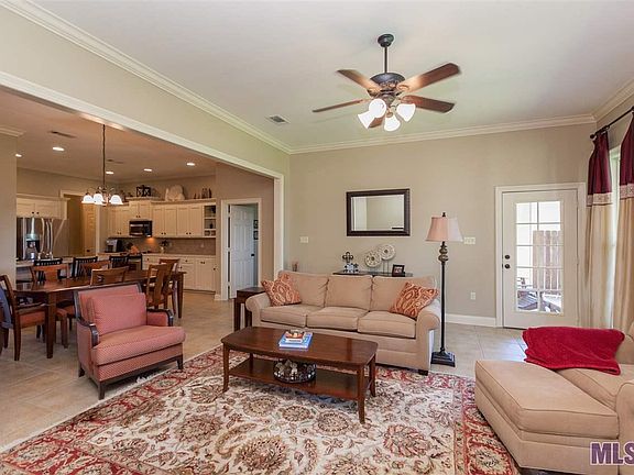Immaculate home and peaceful setting ON THE LAKE, featuring an Open floor plan, and large (11x30) covered patio overlooking the serene backyard. Crown molding throughout, carpet in the bedrooms & ceramic tile floors everywhere else. Neutral colors throughout make this home light & bright. Kitchen overlooks the dining room and living room, with an abundance of cabinets & countertop space, breakfast bar, stainless steel appliances, pantry, and the refrigerator remains! A computer nook and laundry room are just off the kitchen. Washer & dryer also remain! Living room features a corner fireplace and wall of windows with views to the backyard & lots of light. Split floorplan for the bedrooms which allows for privacy. Large Master bedroom overlooks the backyard. En-suite master bath has double vanities, jetted tub, separate shower with seat, and large walk-in closet with built-ins including a fabulous, custom shoe rack! Additional bedrooms have large closets and are adjacent to the hall bath. The large covered patio with gutters & fans was added recently, making it a wonderful entertaining space. Freezer in the garage to remain. The subdivision has a pool, small park, & tennis courts, Great location & close to LSU!