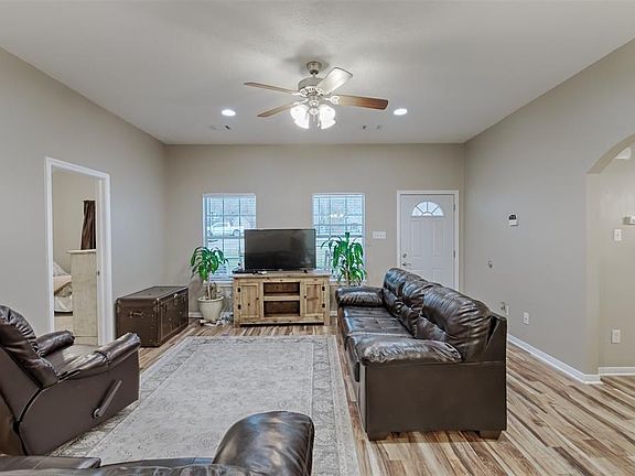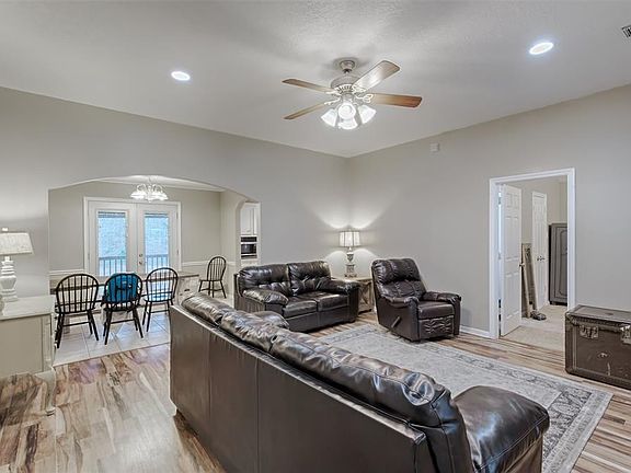 Over 1 acre with a well cared for, move in ready home just minutes from I-45, parks, business development, and numerous amenities. The covered front porch welcomes you in to this well laid out split floor plan. Inside you will find ceiling fans in all the bedrooms to help with energy efficiency, lovely wood laminate flooring, arched doorways, and blinds throughout home. French doors open to the recent covered back porch and coy/goldfish pond. Perfect for relaxing from that morning cup of coffee to a quiet evening meal. There are no rear neighbors and the expansive back yard is waiting on you to bring additional improvements.