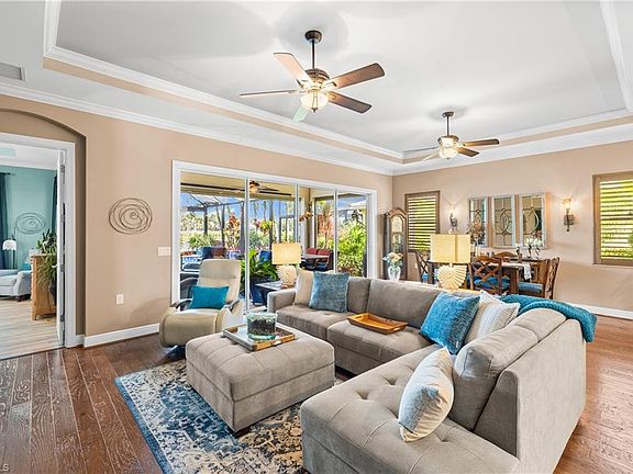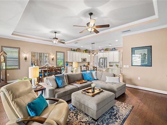 You will be amazed the moment you enter this elegant open concept 3+den / 2.5 bath home in the Carena neighborhood of Pelican Preserve. Spacious San Remo model comes with tons of natural light, amazing open lake and salt swimming pools views with gorgeous sunsets, a modern gourmet kitchen with an island, beautiful cabinetry, granite countertops everywhere, stainless steel appliances and 2 pantries! Too many upgrades to list: Extended lanai, Coffered Living Room, Master Bedroom and Den Ceilings, Crown Molding, Metal Hurricane Shutters with metal locks, Plantation Shutters in the Living Room and Den, Meticulous Landscaping with 12 Palm Trees, and Seated area in the front with a waterfall. Perfect for entertaining and living the Florida lifestyle. Amenities include a town center with fitness center, indoor lap pool and walking track, two resort pools, spa, group exercise rooms, two restaurants/bars, outdoor amphitheater, tennis, pickle ball, movie theater, woodworking/hobby rooms, and a dog park! Optional 27-hole Championship Golf Course has various membership options including social membership.