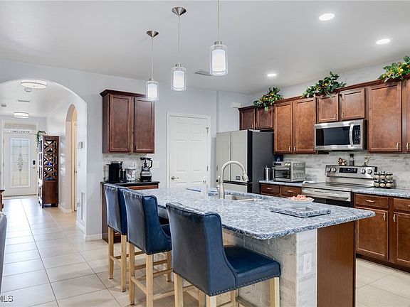 Move in ready - This 3 bedroom 2 bath home has lots of updates and is ready for its new owner. Step inside the screened front porch and through the glass inserted front door and you will discover title throughout the main living area with bamboo floors in the bedrooms. The chefs kitchen offers plenty of counter space with a large island, Quartz counter tops, recessed lighting, backsplash, new 2025 LG stainless steel appliances and large pantry. The primary suit has 2 walk in closets with dual sinks with extended vanity and walk in shower in the bathroom. Laundry room inside home with extra storage cabinets and epoxy flooring in the garage.. Outside you have an extended brick walkway, oversized 18X40 screened porch with a heated spa, a beautiful view of the preserve with a private 5 ft fence for your 4 legged friends and gutters all around the exterior. Mature landscaping includes a Florida Peach Tree, Ruby Red Grapefruit, and Avocado Tree. Fiber optic cables in neighborhood for high speed internet & Cable. There is also a 50 amp generator hook up and storm shutters to protect your family when the weather gets unpredictable. A/C was replaced in 2018. Coming soon nearby there will be a new hospital just steps away from the front entrance to the neighborhood along with a community park across the street. The neighborhood also gated for your security and offers a community pool, fitness room, and playground for the kids. Come and explore the SW Florida lifestyle today at an affordable price.