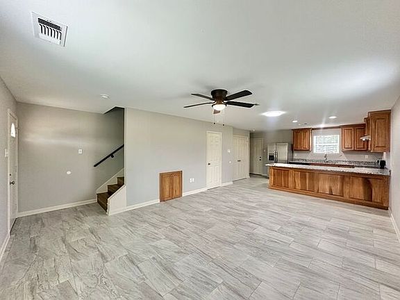 Upstairs, you'll discover two spacious bedrooms and a full bathroom, along with extra storage under the stairs and in the upstairs water heater closet. Shared covered front and back porches provide inviting spaces to relax outdoors, and landscaping is included for low-maintenance living.