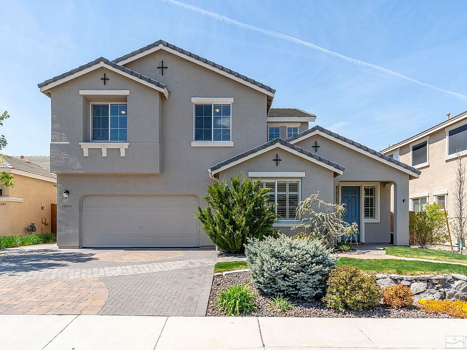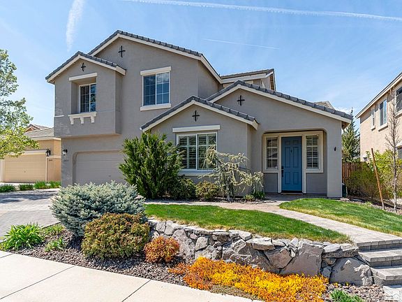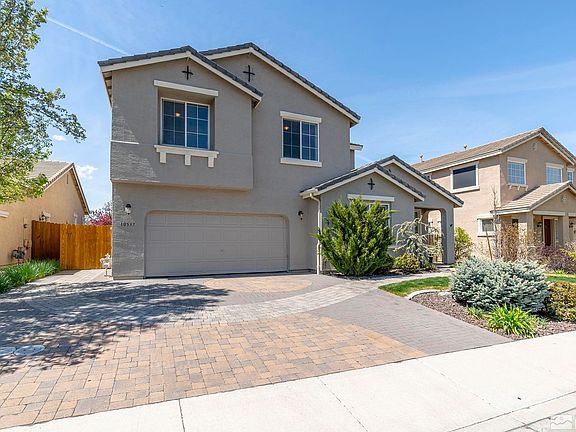 Welcome to your spacious retreat in the heart of Damonte Ranch. Nestled in a tranquil neighborhood, this charming 2-story home boasts 4 bedrooms and 2.5 baths, plus an office/den offering ample space for comfortable living. The upgraded landscaping adorning the front yard adds beautiful and welcoming curb appeal. This home is bright and inviting, with white window shutters and lovely features throughout., The kitchen has it all, featuring a gas range, single oven, dishwasher, built-in microwave, pantry, island, breakfast bar, ample counter space and the refrigerator is included as well! Enjoy the beautiful backyard from the covered paver-patio that also features a pull-down screen for extra shade and privacy. There's also a gas line to the firepit (not currently in use). The garage is tandem style with a large window looking to the back yard, which offers so many options for various uses whether it's extra parking, storage, recreation, or whatever suits your needs! Conveniently located, embrace the serene surroundings with picturesque walking paths just blocks away which lead to the elementary school, and Damonte Ranch High School is just mere minutes walking distance from your front door. Enjoy the shopping, dining, and entertainment options right at your fingertips!