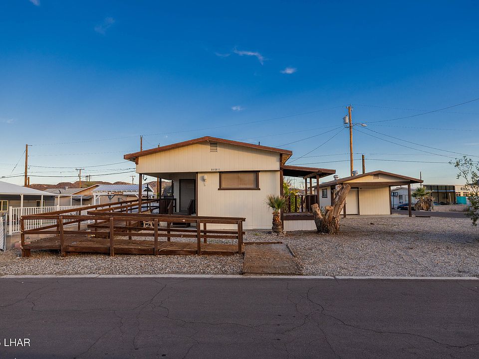 On two Lots with plenty of room for RVs, boats, and guest parking, this property is a great starter home, investment rental, or tear-down opportunity to build your dream toy barn. The existing home features two bedrooms and one bathroom, plus an add-on area already equipped with a window, door and closets, making it easy to convert into a third bedroom. A spacious laundry/utility room provides additional storage and flexibility. Outside you'll find a large storage building that could be transformed into a guest quarters, workshop, or mancave. With a little imagination, the possibilities are endless. Located close to the river and desert, you'll enjoy year-round outdoor activities. Best of all, there's no HOA, and the property is situated on deeded land. Call Today!